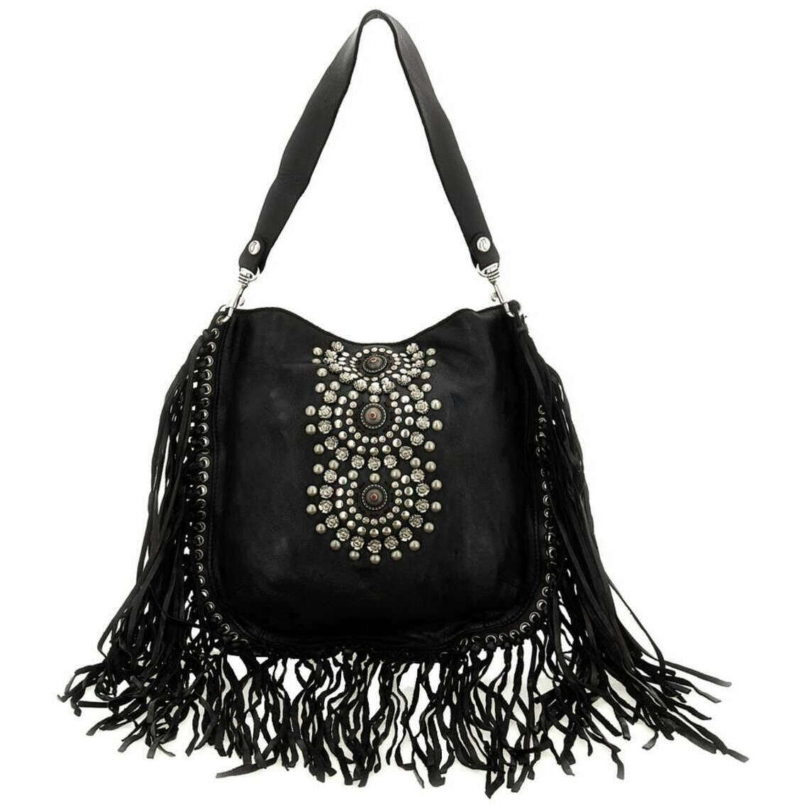 Aus 100 % Rindsleder gefertigt ist diese schwarze Damen-Umhängetasche Camelia des Designers Campomaggi. Es misst 30 cm (Höhe) x 30 cm (Breite) x 0,5 cm (Tiefe). Campomaggi hat diese Camelia-Umhängetasche in Italien hergestellt. Um die Tasche in gutem Zustand zu halten, wird empfohlen, sie mit einem feuchten Tuch zu bürsten und auf die Verwendung von Reinigungsmitteln zu verzichten. Alle Taschen werden komplett in einer Campomaggi-Verpackung geliefert. Die Campomaggi Camelia Umhängetasche – Schwarz ist eine unverzichtbare Alltagstasche, die Ihrer Kleidung Luxus und einen lustigen Look verleiht. Die Quasten und Strasssteine ​​sorgen für einen eleganten und mädchenhaften Touch, während der abnehmbare Schultergurt und der abnehmbare, verstellbare Umhängegurt je nach Anlass für Vielseitigkeit sorgen. Das Hauptfach bietet ausreichend Stauraum, sodass Sie Ihre wichtigsten Utensilien immer dabei haben. Es ist aus hochwertigem Leder gefertigt und weist eine wunderschöne Vintage-inspirierte Farbe auf, die durch pflanzliches Gerben entsteht. Dabei handelt es sich um ein traditionelles Verfahren, bei dem natürliche Inhaltsstoffe für ein reichhaltiges Finish verwendet werden.