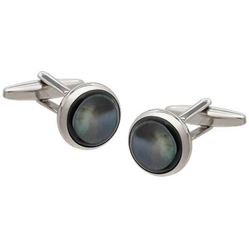 • Standard-Manschettenknopf-Bascule, 14 mm Durchmesser, konkav getauchter rauchiger Perlmuttstein, natürliche Halbedelsteine, Silbergehäuse