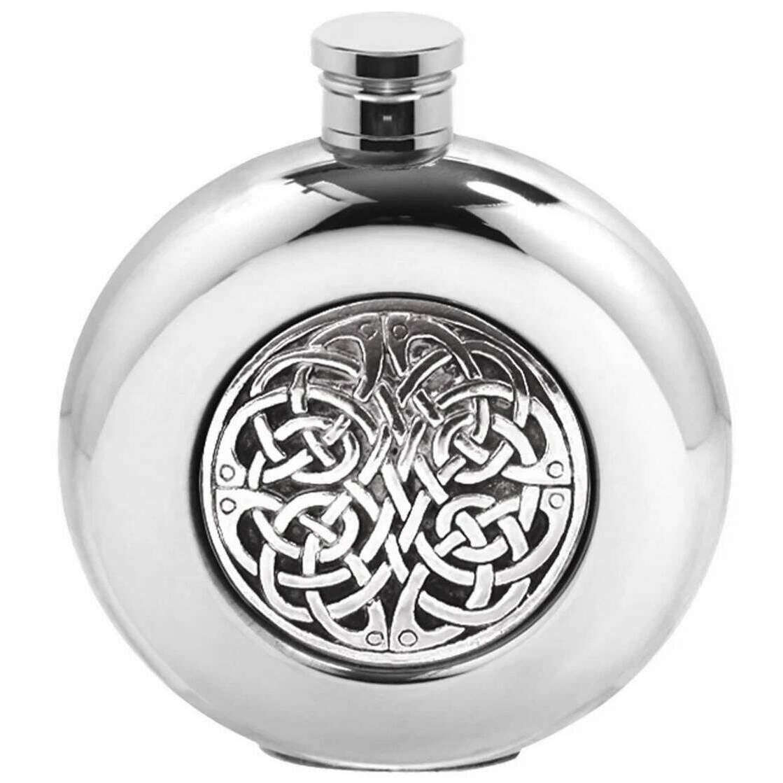 Englische Zinnfirma 6oz Runde Keltische Scheibeflasche - Silber