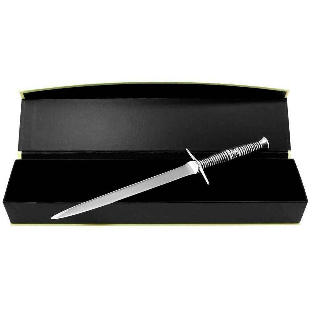 Perfekt für Männer oder Frauen ist diese englische Pedter Company Silver Celtic Sword Letter Opener, die auch aus Zinn hergestellt wird. Es misst 21,25 cm (Höhe). Alle Schreibtischzubehör werden in einer englischen Geschenkbox des Zinnunternehmens abgeschlossen. Der englische Keltic Sword Letter Opener - Silver ist ein ideales Zubehör, das Sie beim Öffnen Ihrer Post übergeben müssen, und gibt Ihnen einen sauberen Schnitt anstelle der unbegrenzten Rips, die Sie bei der Verwendung Ihrer Finger erhalten. Es ist eine viel einfachere Methode, die die Aufgabe viel effizienter macht.