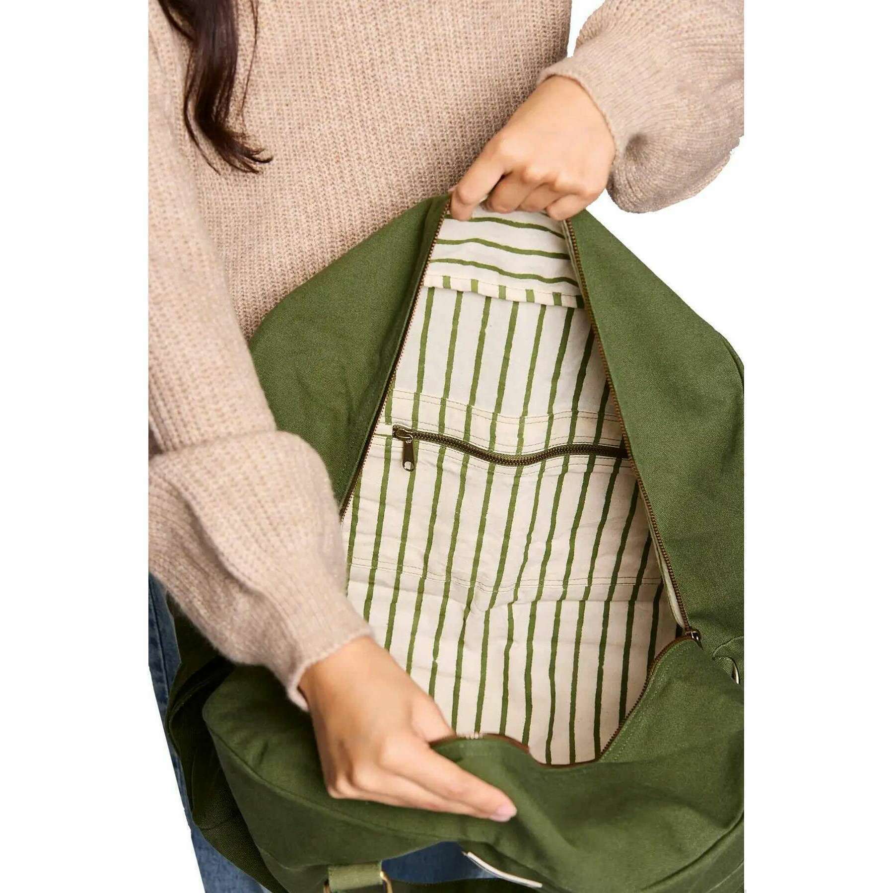 Hergestellt aus 100% Bio -Baumwolle, wird dieser Olivengrün -Unisex -Yves große Reisetasche vom Designer Hindbag hergestellt. Es misst 33 cm (Höhe) x 54 cm (Breite) x 24 cm (Tiefe). Alle Taschen sind mit Hinterbeutelverpackungen ausgestattet. Der Hindbag Yves Large Reisetasche - Olivengrün ist eine geräumige und umweltfreundliche Option für Reisende. Diese Tasche, die aus dickem gefertigtem organische Bio-Baumwolle gefertigt ist, verfügt über mehrere Taschen für die Organisation, einen sicheren Reißverschluss und ein gedrucktes Innenfutter, das einen Hauch von Eleganz verleiht. Mit seinen Griffen und einem großen verstellbaren Schultergurt kann diese Tasche leicht von Hand oder auf der Schulter getragen werden.