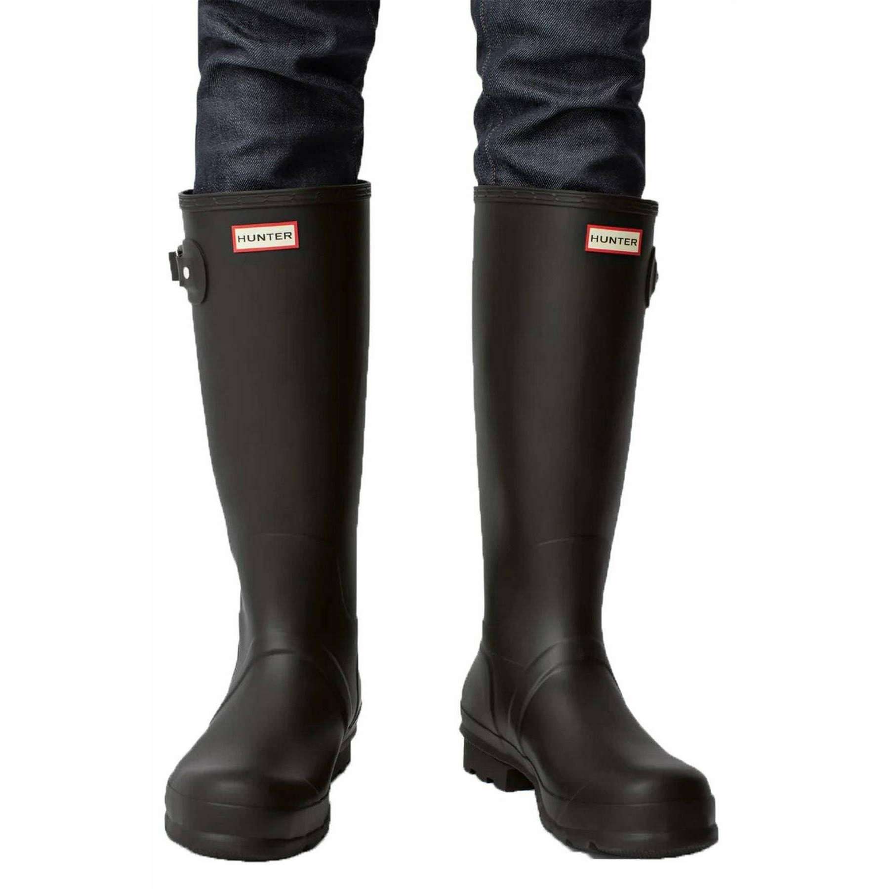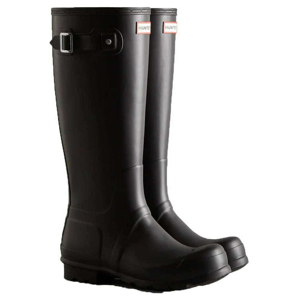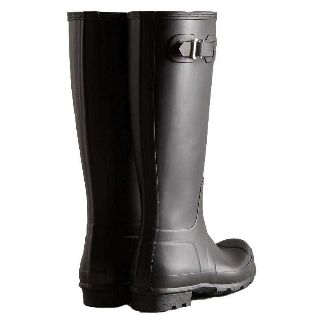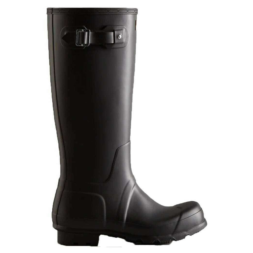 This men's original tall wellington boots has been made from 100% rubber, featured in a black colour and is from the brand Hunter. Alle Gummistiefel werden komplett in der Hunter-Verpackung geliefert. Die Hunter Original Tall Gummistiefel – Schwarz bieten den legendären Schutz, den Hunter seit 1956 bietet. Sie werden aus 28 handgeschnittenen Naturkautschukteilen handgefertigt und über drei Tage zusammengebaut, bevor sie für volle Wasserdichtigkeit vulkanisiert werden. The boot features a matte finish, a recycled polyester lining, and the Hunter Original tread pattern for secure grip. Designed to repel water and prevent moisture penetration, this certified vegan boot is an essential choice for wet?weather wear.