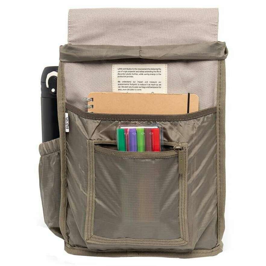 • 8L-Kapazität, großer Klappenverschluss, großes Hauptfach, separate Tasche, Reißverschlusstasche auf Klappe, Sicherheitstasche auf der Rückseite, verstellbare Griffe, Metallhakenbefestigung, veganer, wasserfestes, Innenflaschentasche, aus 11 Haustierflaschen hergestellt