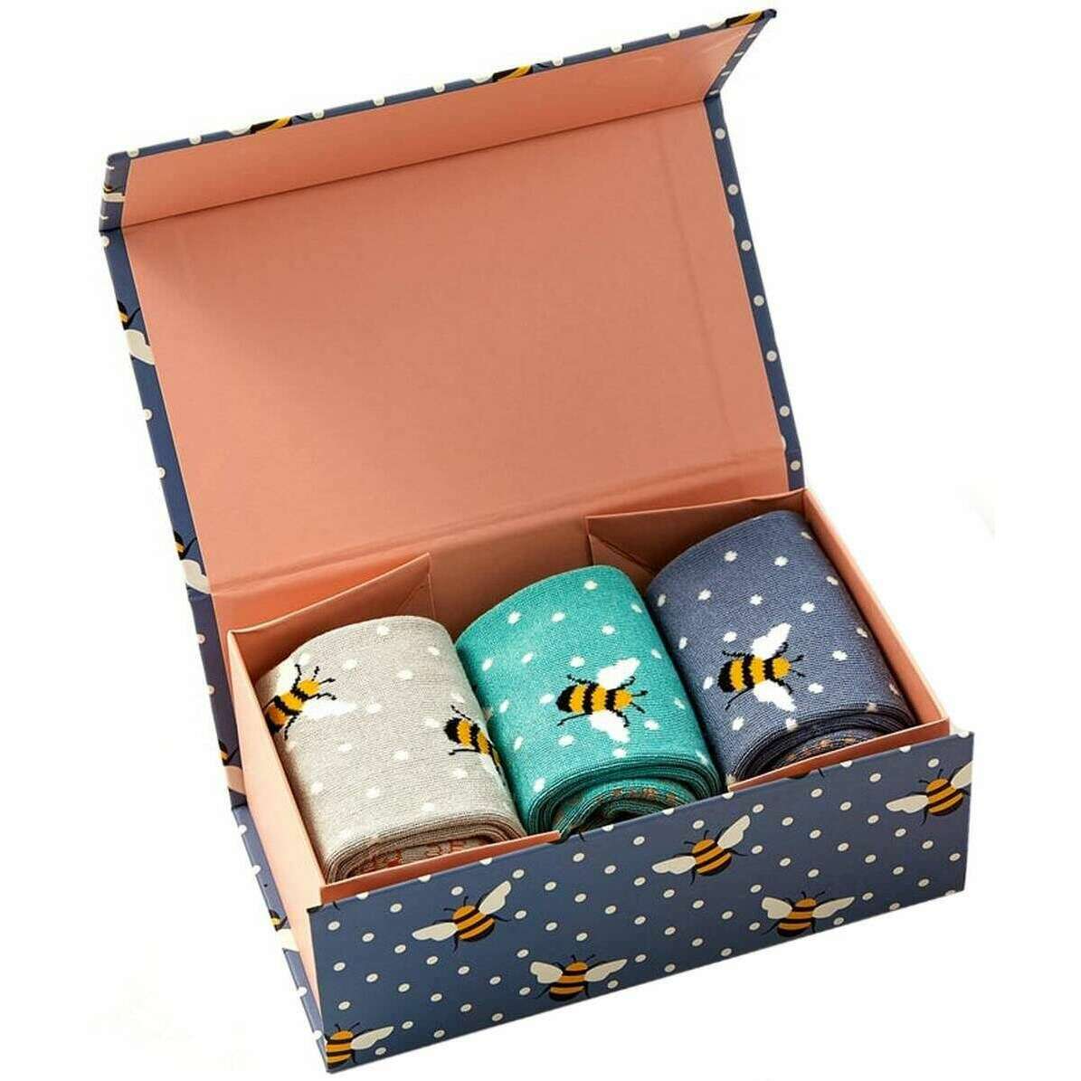 Miss Sparrow London 3er-Pack Bumble Bee Sockenbox – Grün/Blau/Grau