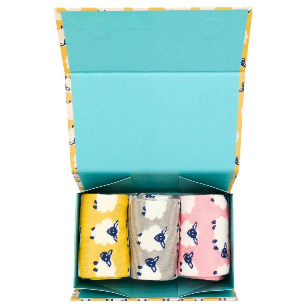Miss Sparrow London 3er-Pack Happy Sheep Sockenbox – Gelb/Grau/Rosa
