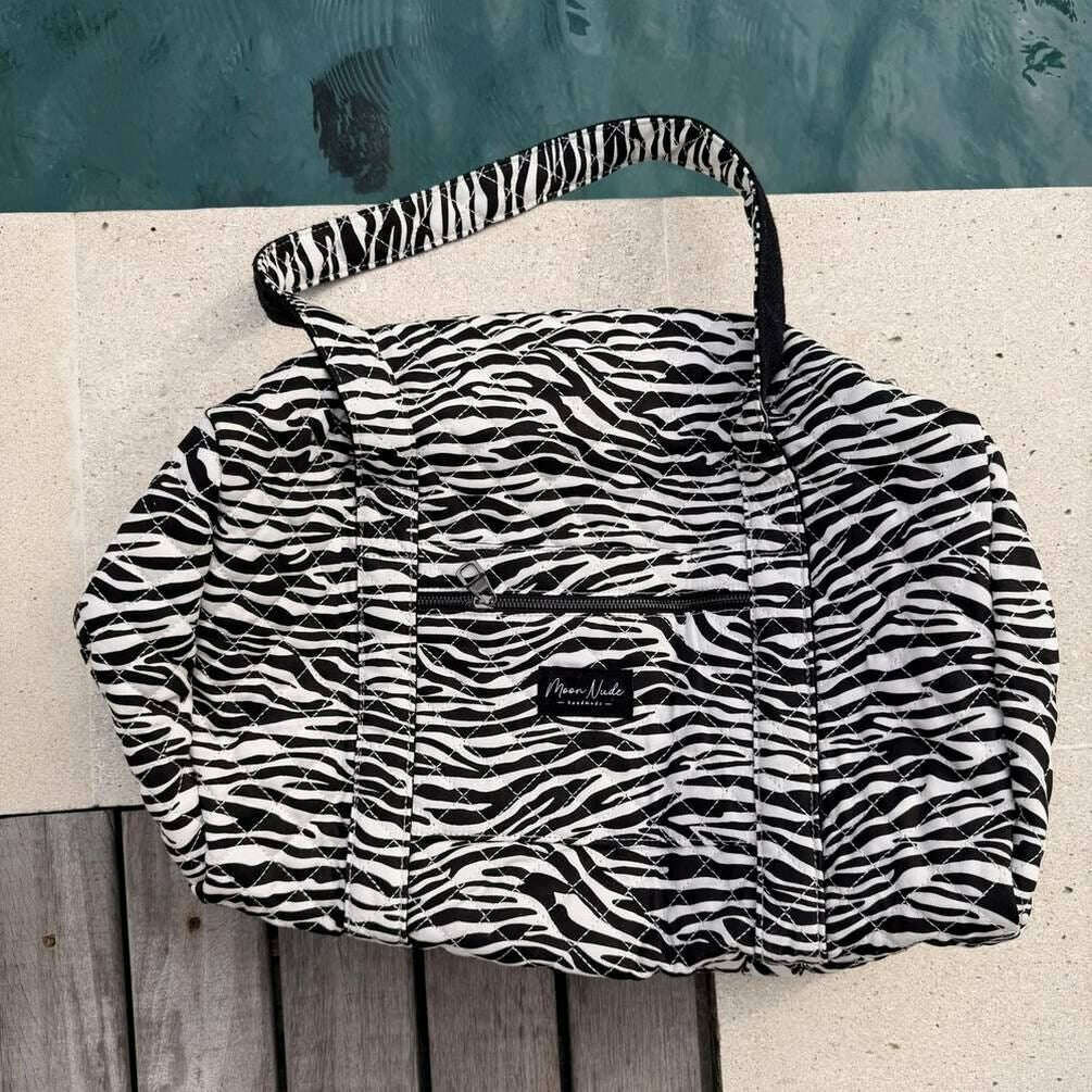 Designer Moon Nude hat Ihnen diese Damentasche aus 100 % Baumwolle in Weiß-/Schwarztönen präsentiert. Es misst 30 cm (Höhe) x 50 cm (Breite) x 28 cm (Tiefe). Es wird empfohlen, es von Hand in kaltem Wasser mit einem milden Reinigungsmittel zu waschen oder es im Schonwaschgang auf links zu waschen. um diese Tasche in gutem Zustand zu halten. Alle Taschen werden komplett in einer Moon-Nude-Verpackung geliefert. Die Moon Nude Noir Large Duffel Bag – Weiß/Schwarz verfügt über ein wunderschönes handgefertigtes Steppdesign. Diese Tasche verfügt über eine Außentasche mit Reißverschluss, einen geräumigen Innenraum und zwei große Griffe, perfekt für Wochenendausflüge oder den Transport vieler Habseligkeiten.
