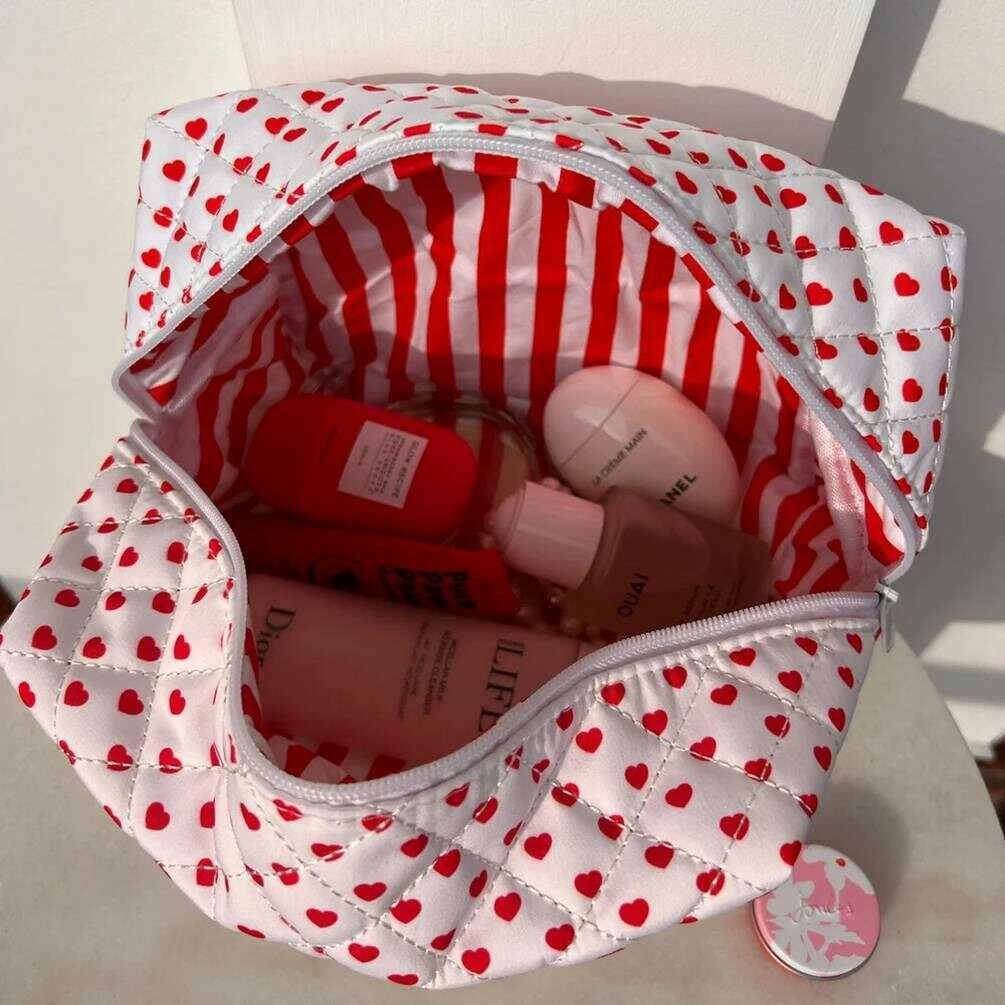 Diese große Valentins-Kosmetiktasche von Moon Nude besteht aus 100 % weißer Baumwolle und ist perfekt für Frauen und ein Muss. Es misst 15 cm (Höhe) x 25 cm (Breite) x 15 cm (Tiefe). Es wird empfohlen, es von Hand in kaltem Wasser mit einem milden Reinigungsmittel zu waschen oder es im Schonwaschgang auf links zu waschen. um diese Tasche in gutem Zustand zu halten. Alle Taschen werden komplett in einer Moon-Nude-Verpackung geliefert. Die große Make-up-Tasche Moon Nude Valentine – Weiß/Rot ist ein absolutes Muss für Ihr Zimmer oder Ihre Alltagstasche. Diese Make-up-Tasche bewahrt alle Ihre am häufigsten verwendeten Produkte garantiert sicher auf und ist mit ihrem handgefertigten Steppdesign gleichzeitig stilvoll und schick.