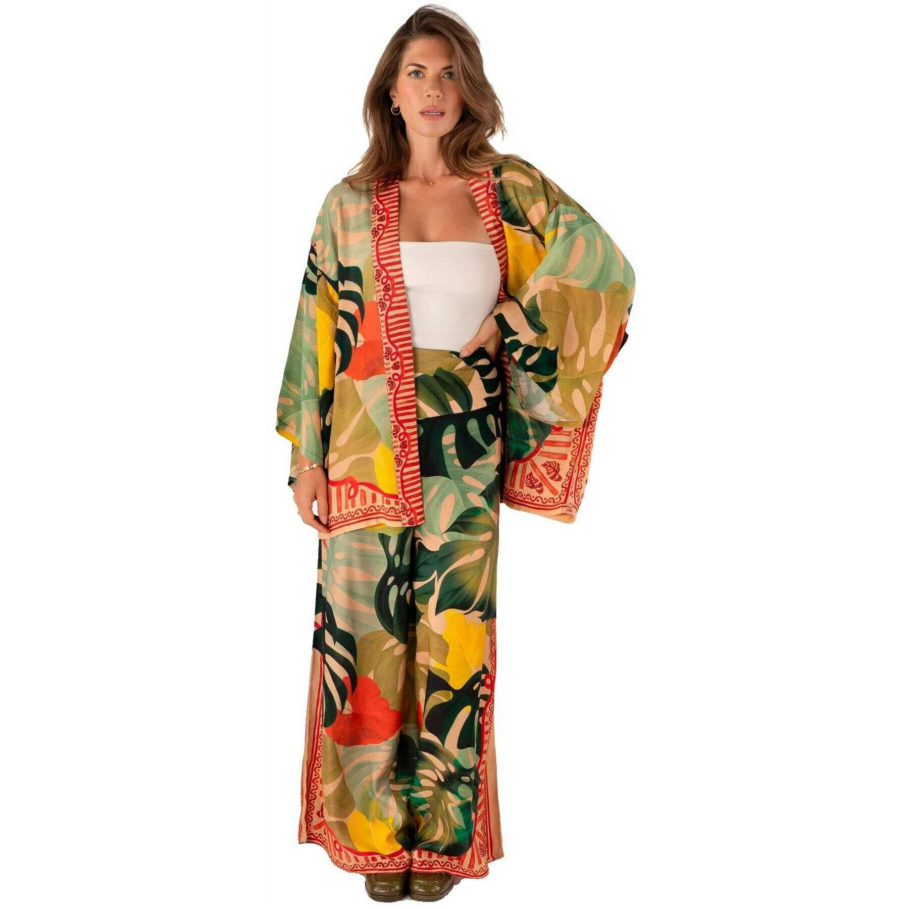 Powder Exotic Leaves Kimono-Jacke – Grün/Beige/Gelb
