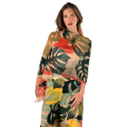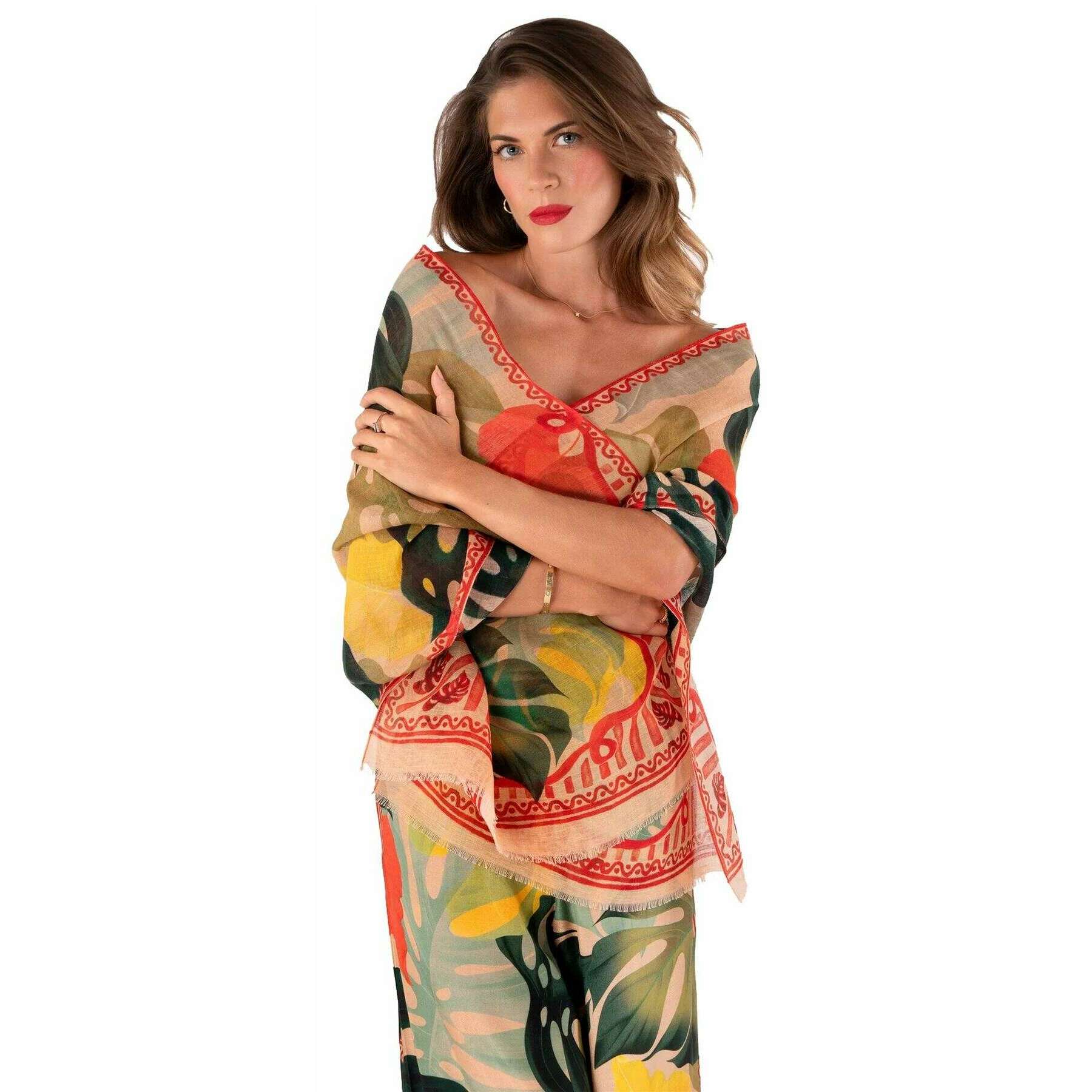 Schal aus Leinen-Baumwolle mit exotischen Blättern in Pulverform – Beige/Rot/Blau
