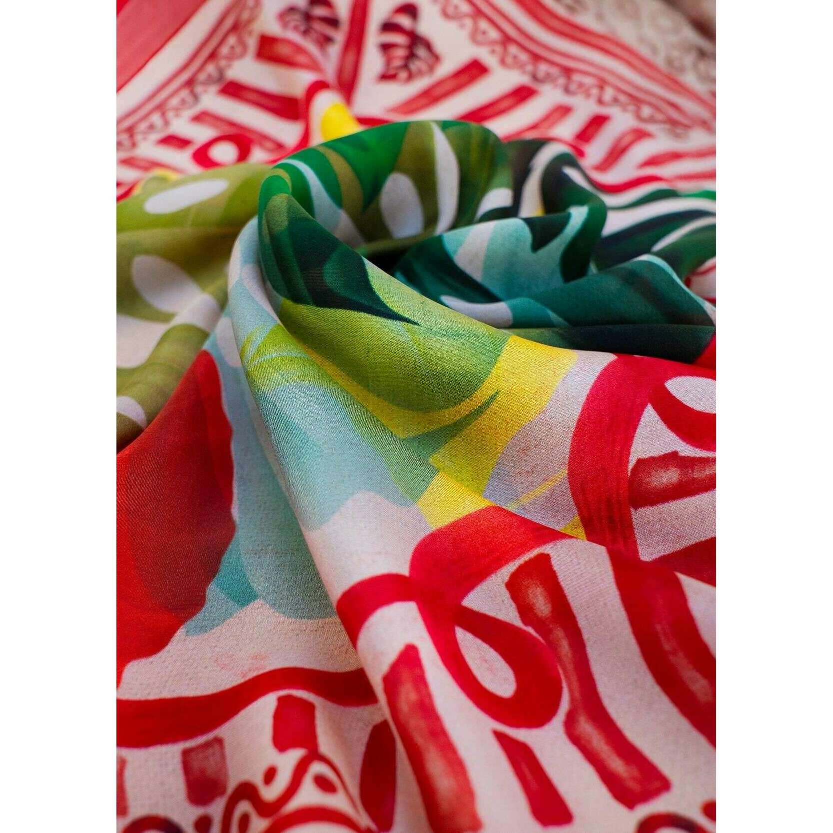 Quadratischer Schal aus Seide mit exotischen Blättern in Pulverform – Rot/Beige/Grün