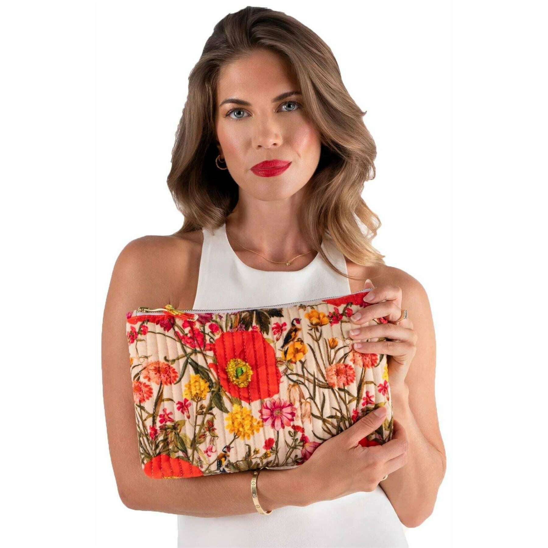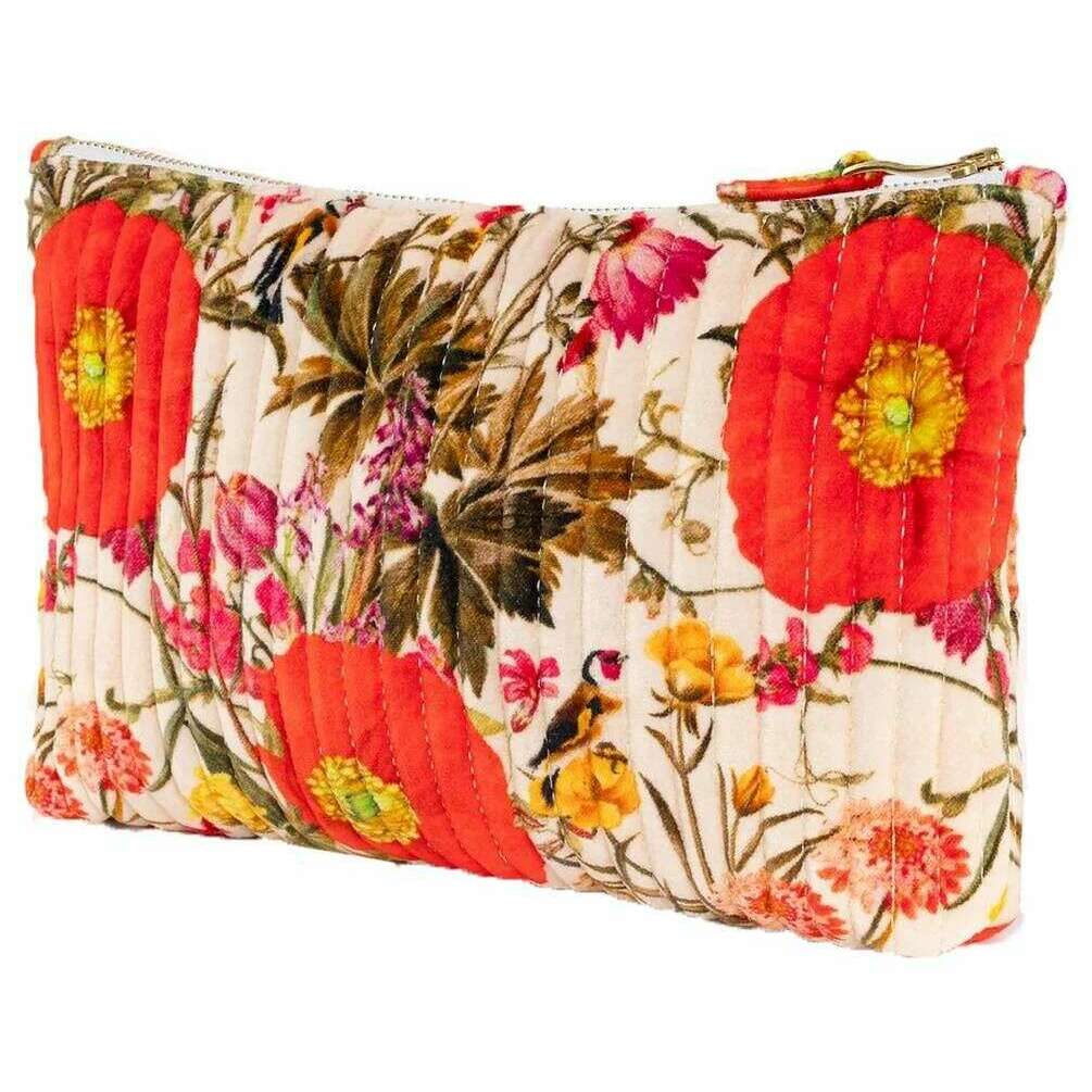 Reißverschlusstasche aus gestepptem Samt mit puderfeinen Blumen – Weiß/Rot/Beige