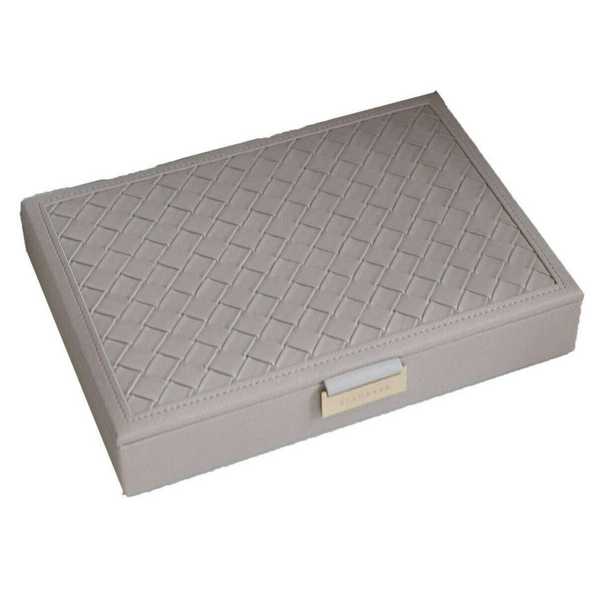 Dieser klassische Schmuckschatullendeckel für Damen wurde von der Marke entworfen Stackers in grauer Farbe und besteht aus Kunstleder und Samt. Es misst 4,7 cm (Höhe) x 25 cm (Breite) x 18 cm (Tiefe). Alle Schmuckkästchen werden komplett mit einer Stapelverpackung geliefert. Die Stackers Der Deckel der klassischen Schmuckschatulle – Taupe verfügt über ein wunderschönes gewebtes Taupe-Design. Dieser Schmuckkästchendeckel ist perfekt für die Aufbewahrung all Ihrer Schmuckstücke! Wird komplett mit Abschnitten in mehreren Größen für Ringe, Ohrringe, Armbänder und Halsketten geliefert.
