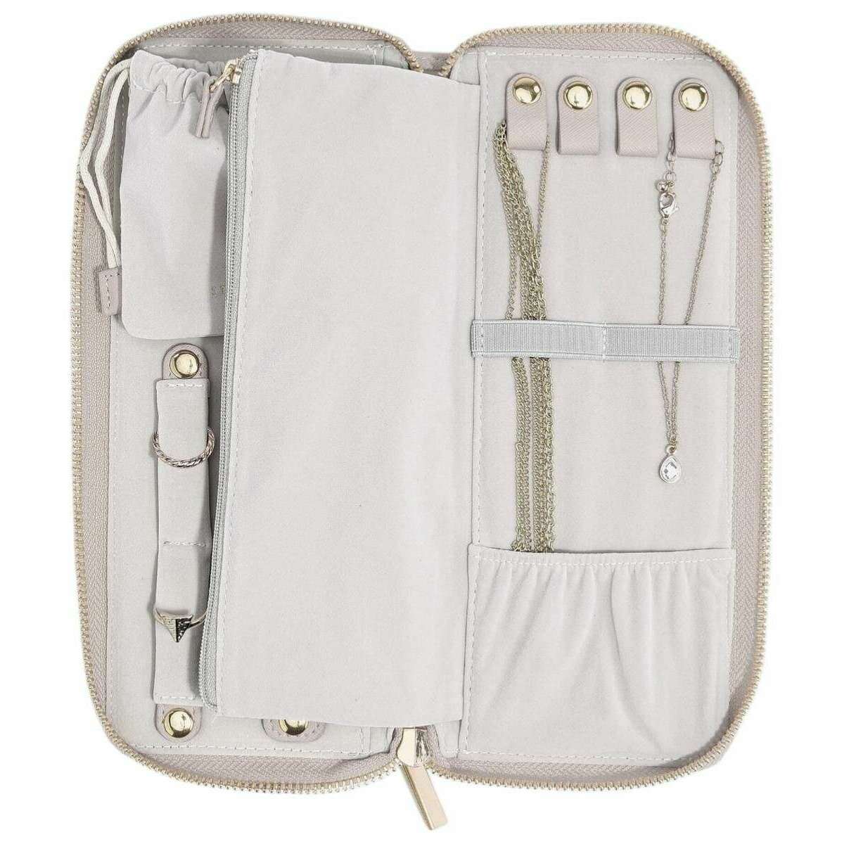 Diese taupebeige, klassische mittelgroße Schmuckrolle für Damen des Designers ist aus Kunstleder und Samt gefertigt Stackers. Es misst 3 cm (Höhe) x 24,5 cm (Breite) x 10,5 cm (Tiefe). Es wird empfohlen, die Schmuckschatulle sauber zu wischen, um sie in gutem Zustand zu halten. Alle Schmuckkästchen werden komplett mit einer Stapelverpackung geliefert. Die Stackers Die klassische mittelgroße Schmuckrolle – Taupe Beige verfügt über eine Vielzahl von Teilen, mit denen Sie Ihren Schmuck jederzeit und überall organisieren können. Dank des Reißverschlusses können Sie sicher sein, dass Ihre Lieblingsschmuckstücke jederzeit sicher im Inneren aufbewahrt werden. Diese Rolle bietet Platz für bis zu vier Halsketten oder Armbänder, verfügt über einen Ohrringhalter und einen kleinen Samtbeutel zur sicheren Aufbewahrung kleiner und loser Gegenstände. A Das Besondere an diesem Zubehöretui ist, dass Sie Ihre Lieblingsketten und -armbänder aufbewahren können, ohne dass sich diese verheddern. Dies ist der perfekte Schmuck-Organizer für Reisen oder einfach, um Ihr Zuhause sauber und ordentlich zu halten.
