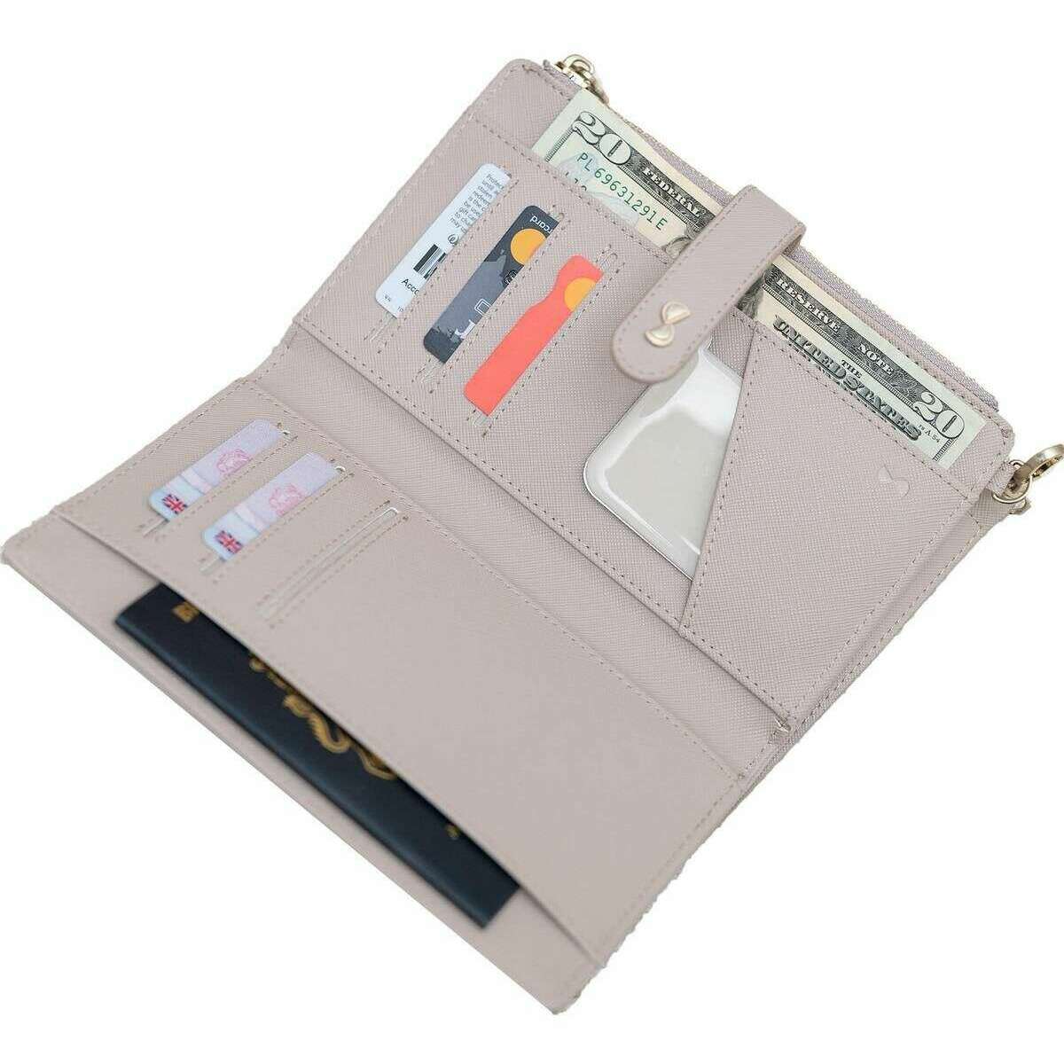 • Externes Handyfach, 6 Kartenfächer, Kosmetikspiegel, abnehmbares Münzfach mit Reißverschluss, abnehmbare Handschlaufe, Druckknopfverschluss