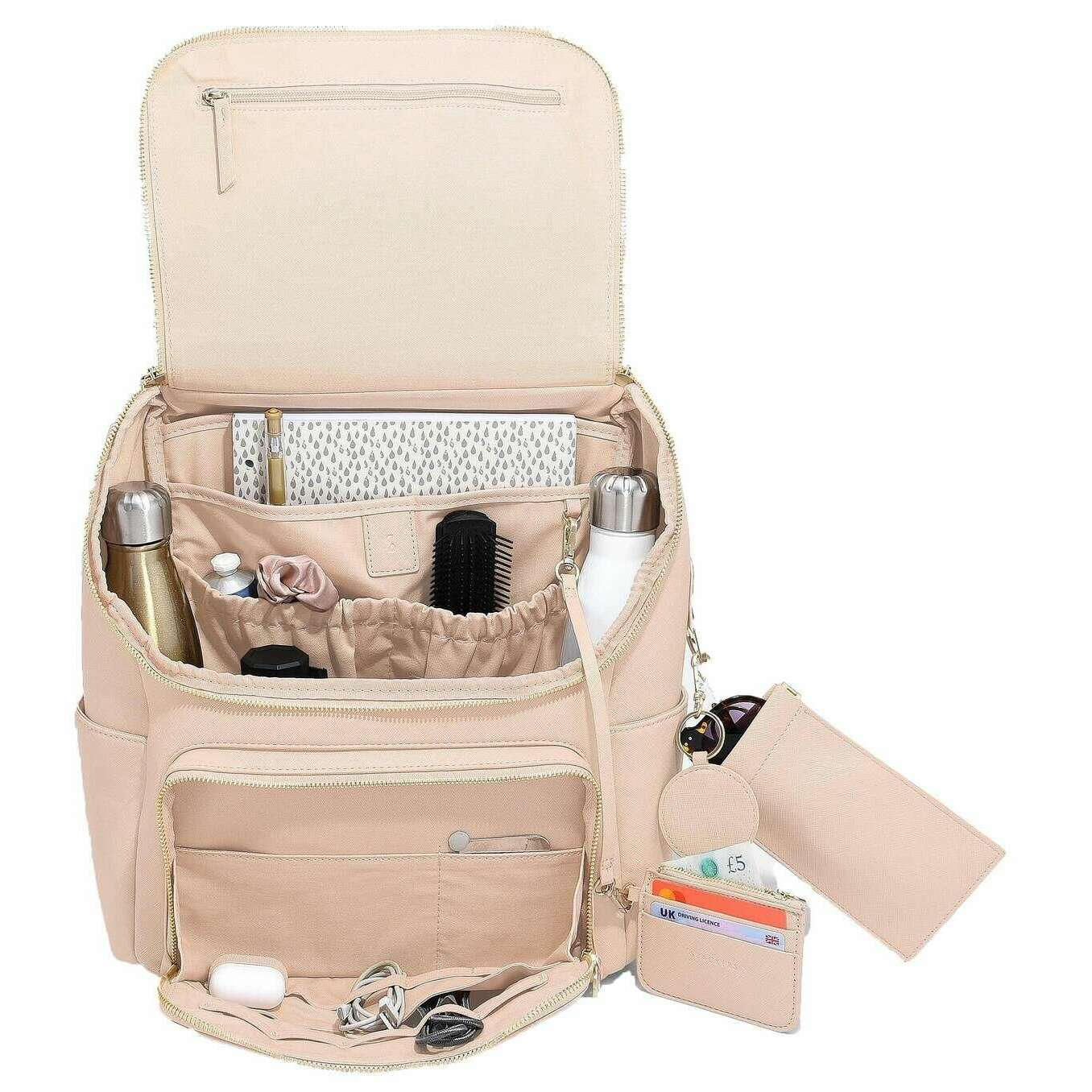 Präsentiert von der Marke Stackers, Dieser Luxus-Rucksack für Damen in Rosa/Gold besteht aus recyceltem PU. Es misst 35 cm (Höhe) x 31 cm (Breite) x 15,7 cm (Tiefe). Alle Taschen werden komplett in einer Stapelverpackung geliefert. Die Stackers Der luxuriöse Rucksack – Blush Pink/Gold ist perfekt für den täglichen Gebrauch. Dieser rosafarbene Rucksack verfügt über ein Laptopfach, mehrere Fächer und eine Reihe kleinerer Taschen. Komplett mit verstellbaren Rucksackgurten und einem Reißverschluss für zusätzliche Sicherheit.