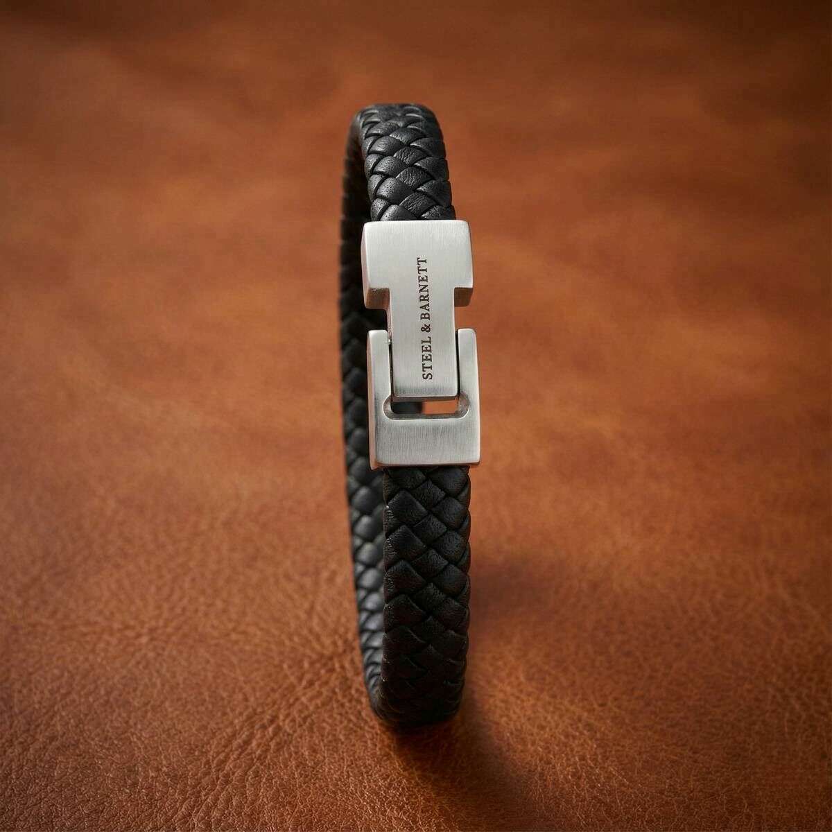 Dieses geflochtene Archie-Lederarmband für Herren der Marke Steel & Barnett besteht aus 100 % Nappaleder und Edelstahl und ist in Schwarz gehalten. Alle Armbänder werden komplett in einer Stahl- und Barnett-Verpackung geliefert. Das geflochtene Lederarmband „Archie“ von Steel & Barnett in Schwarz verkörpert die perfekte Balance aus Schlichtheit und Eleganz. Das fachmännisch von Hand aus echtem Nappaleder gefertigte, glatte 8-mm-Band bietet eine klare, minimalistische Ästhetik, die zu jedem Stil passt. Das Design wird durch eine charakteristische Schließe aus gebürstetem Silber aufgewertet, in die das STEEL & BARNETT-Logo fein eingraviert ist und die einen subtilen Hauch von Unterscheidungskraft bietet. Das auf Langlebigkeit ausgelegte Armband verfügt über einen Verschluss aus hochwertigem 316L-Edelstahl, der für seine Haltbarkeit und Korrosionsbeständigkeit bekannt ist. Der Magnetverschluss sorgt für müheloses Tragen und sorgt den ganzen Tag über für einen sicheren und bequemen Sitz. Der vielseitige und raffinierte Archie passt nahtlos von formellen Anlässen zu lässigen Anlässen und verleiht jedem Outfit eine Schicht dezenter Eleganz.