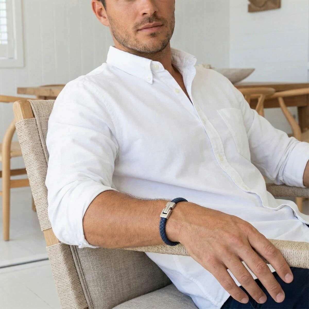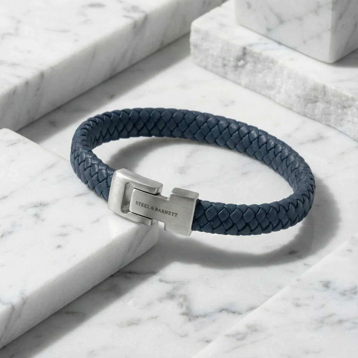 Dieses geflochtene Archie-Lederarmband für Herren besteht aus 100 % Nappaleder und Edelstahl, ist in einer blauen Farbe gehalten und stammt von der Marke Steel & Barnett. Alle Armbänder werden komplett in einer Stahl- und Barnett-Verpackung geliefert. Das geflochtene Lederarmband Archie von Steel & Barnett – Jeansblau verkörpert die perfekte Balance aus Schlichtheit und Eleganz. Das fachmännisch von Hand aus echtem Nappaleder gefertigte, glatte 8-mm-Band bietet eine klare, minimalistische Ästhetik, die zu jedem Stil passt. Das Design wird durch eine charakteristische Schließe aus gebürstetem Silber aufgewertet, in die das STEEL & BARNETT-Logo fein eingraviert ist und die einen subtilen Hauch von Unterscheidungskraft bietet. Das auf Langlebigkeit ausgelegte Armband verfügt über einen Verschluss aus hochwertigem 316L-Edelstahl, der für seine Haltbarkeit und Korrosionsbeständigkeit bekannt ist. Der Magnetverschluss sorgt für müheloses Tragen und sorgt den ganzen Tag über für einen sicheren und bequemen Sitz. Der vielseitige und raffinierte Archie passt nahtlos von formellen Anlässen zu lässigen Anlässen und verleiht jedem Outfit eine Schicht dezenter Eleganz.
