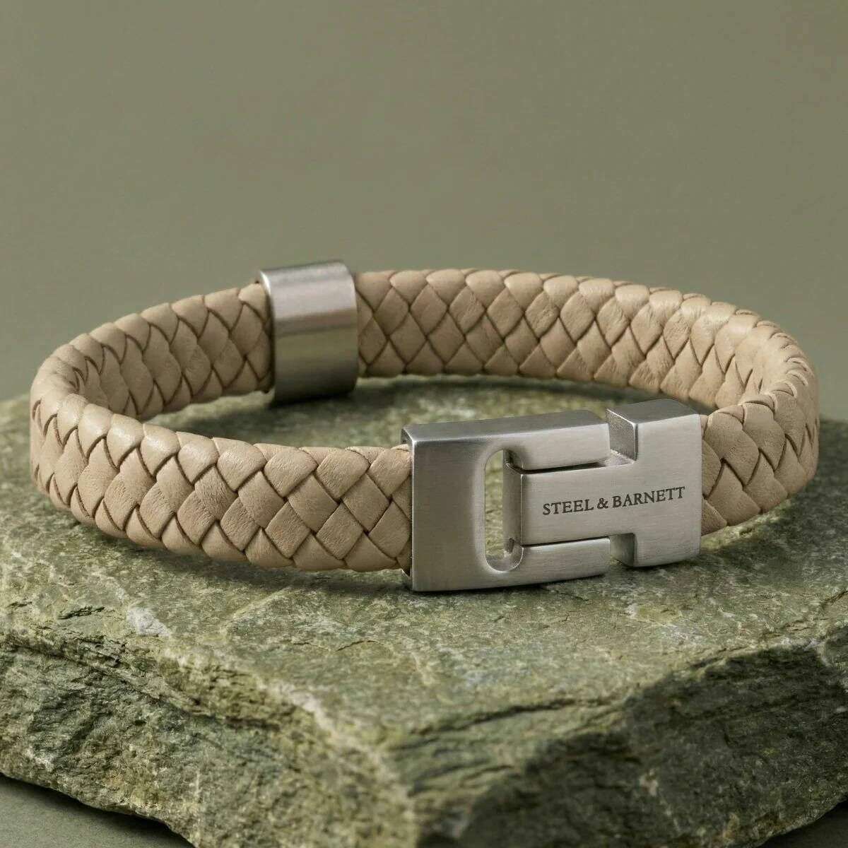 Dieses ecru-cremefarbene Harrison-Armband aus geflochtenem, dickem Leder für Herren des Designers Steel & Barnett ist zu 100 % aus Nappaleder und Edelstahl gefertigt. Alle Armbänder werden komplett in einer Stahl- und Barnett-Verpackung geliefert. Das Steel & Barnett Harrison Armband aus dickem geflochtenem Leder – Ecru Cream stellt eine raffinierte Mischung aus erstklassiger Handwerkskunst und raffiniertem Design dar. Die dicke, aufwendig geflochtene Struktur ist aus 100 % echtem Nappaleder handgefertigt und bietet sowohl Haltbarkeit als auch zeitlosen Reiz. Mit einer Breite von 12 mm bietet es eine beeindruckende und dennoch vielseitige Präsenz, die zu einer Vielzahl von Looks passt. Das Armband ist mit einer Schließe aus gebürstetem Stahl versehen, die aus 316L-Edelstahl für höchste Festigkeit und Korrosionsbeständigkeit gefertigt ist. Sein Magnetverschluss sorgt für einen sicheren und mühelosen Verschluss und macht ihn so praktisch wie stilvoll. Der Harrison eignet sich perfekt für den modernen Berufstätigen und lässt sich nahtlos zwischen Geschäftskleidung und Freizeitkleidung wechseln und verleiht jedem Ensemble eine vornehme Note.